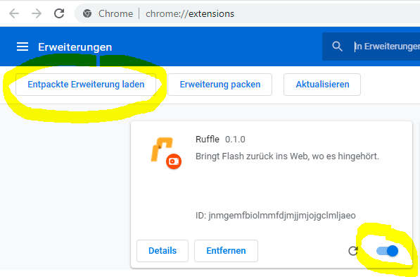 - Auf der Seite https://ruffle.rs/#releases das Plugin herunterladen (Browser Extension) und entpacken