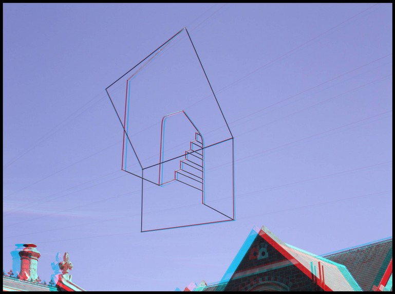 Wenn es in Deiner Familie eine 3D-Brille mit rot/grünen oder rot/blauen Folien gibt, dann sieh dir das folgende Bild mit dieser Brille an (rot ist vor dem linken Auge). Dann kannst Du besser sehen, welche Form die Skulptur im Raum hat. Dieses Bild kannst Du auf jedem Bildschirm betrachten.